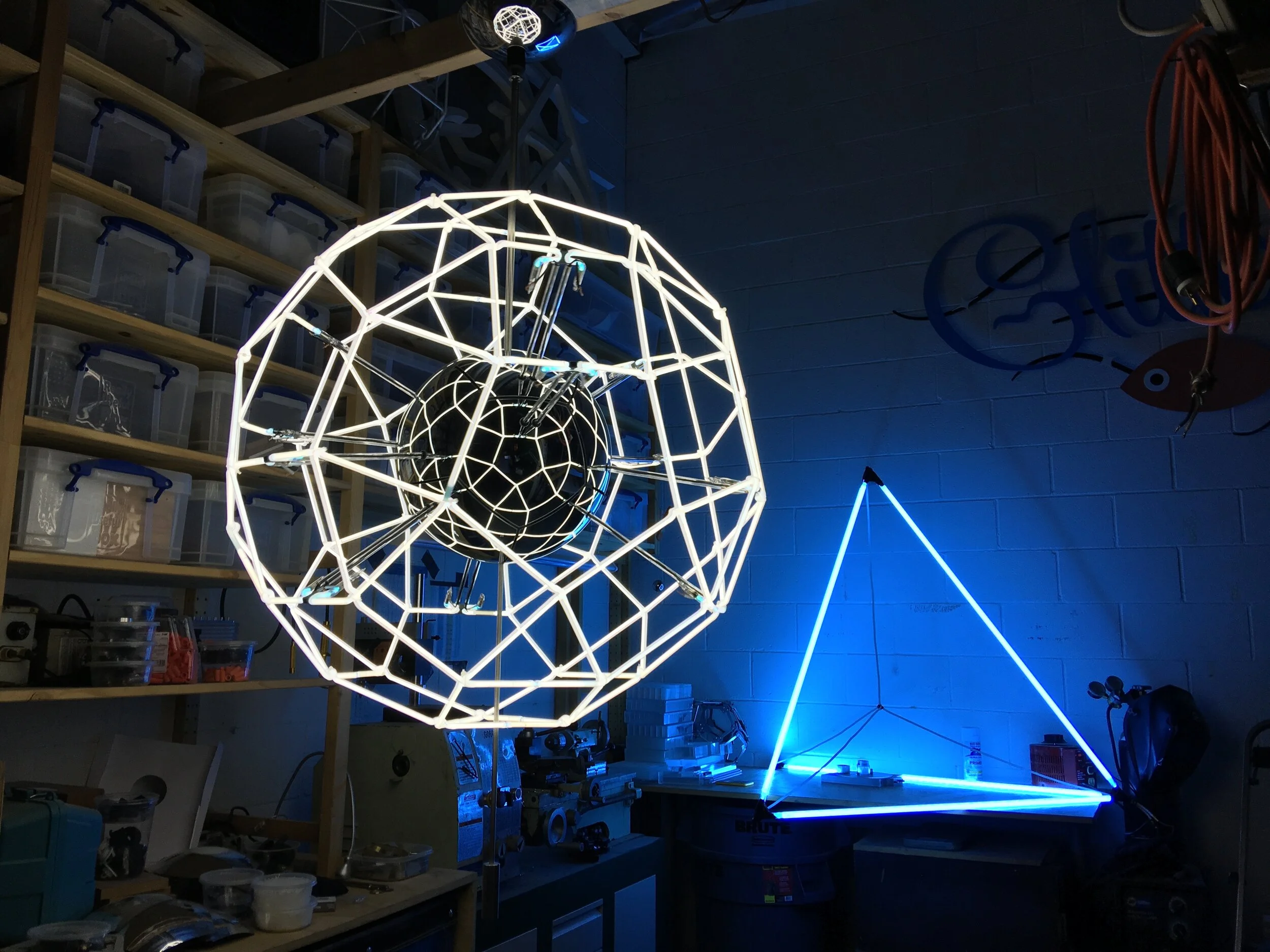 Hedron is a kinetic light sculpture consisting of a neon shell with a mirrored glass sphere at its center. 12 two-dimensional neon decagons are assembled to create a three-dimensional shape, with each decagon individually powered and programmed to produce a pulsating effect. The central core houses all of the transformers, motors and other electronics that make the sculpture function, while reflecting the neon shell in unexpected ways. The neon itself is white, however a secondary orange color is momentarily visible every time the tubes are de-energized.